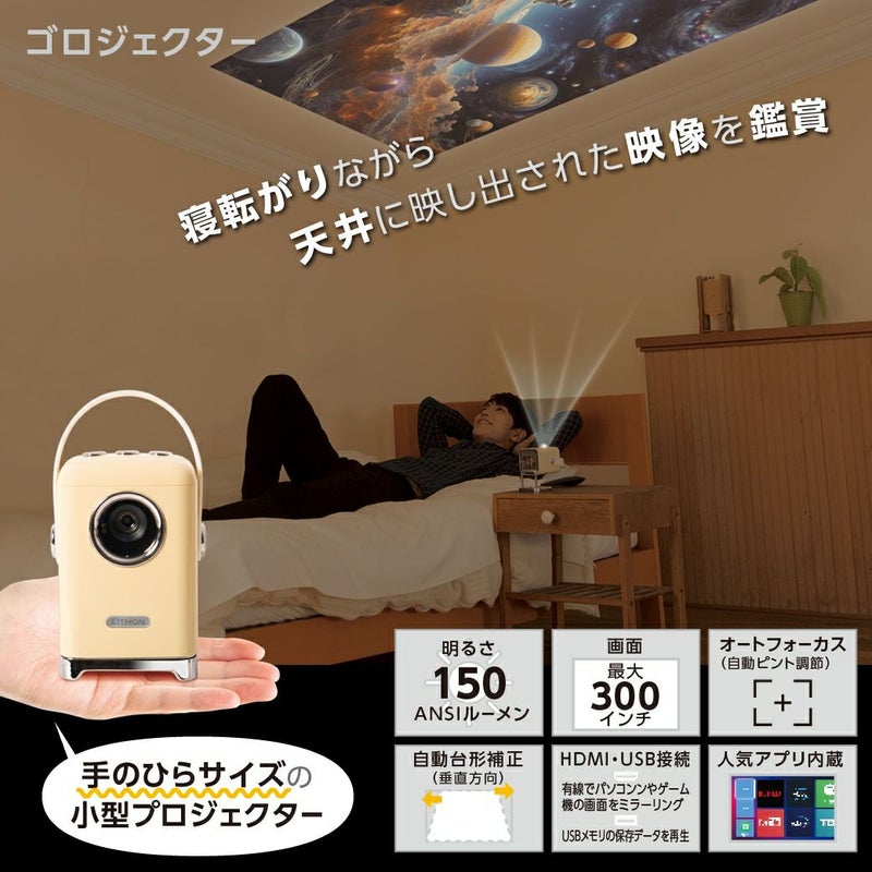 壁や天井に投影してゴロゴロしながら映像を楽しめる!手のひらサイズの小型プロジェクター。