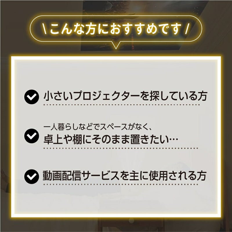 狭い部屋でも置き場所に困りません。デスクに置いたり、ベッドの近くに置いたりと移動も簡単。好きな場所で映像を楽しむことができます。