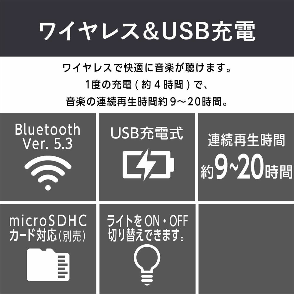 1 度の充電(約4時間)で、音楽の連続再生時間約9?20時間。