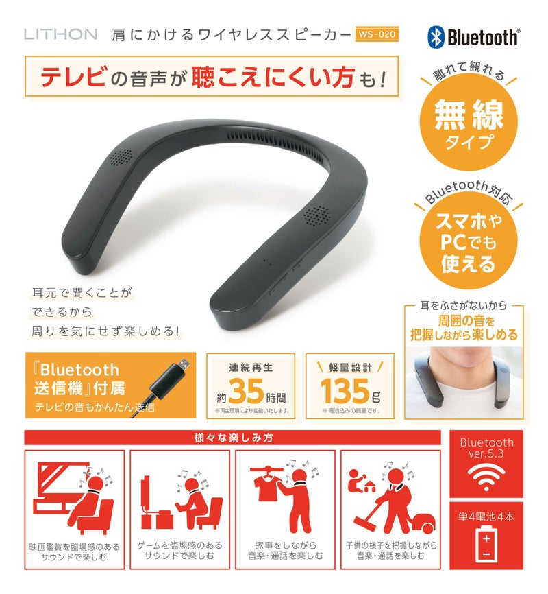 高齢者でも使いやすい電池式のウェアラブルスピーカー