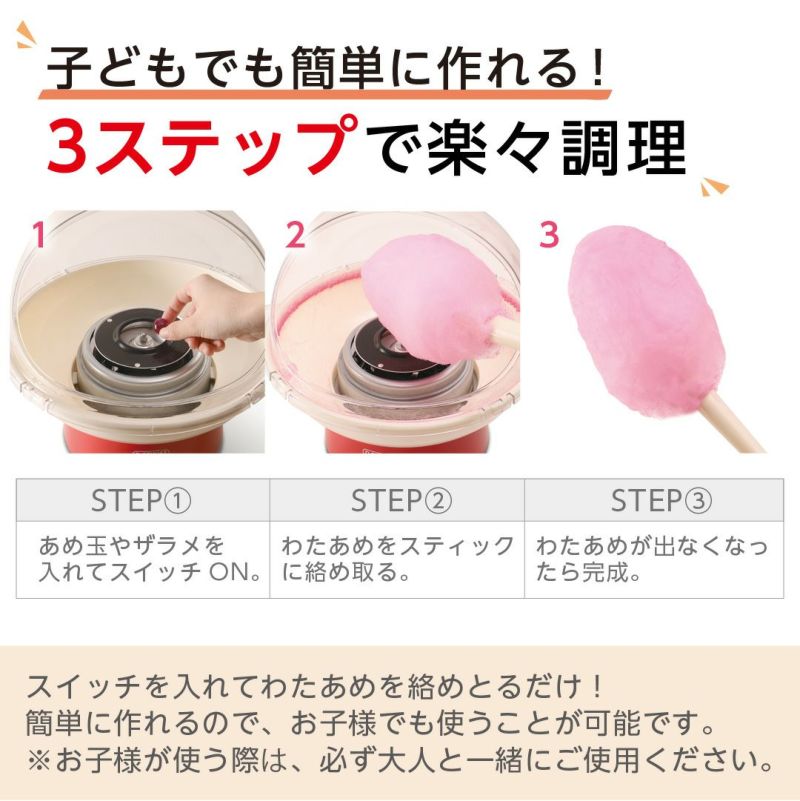 職場の保育園でお祭りごっこをしました。ザラメは松屋町で購入。1.2歳児12人が初めての綿菓子!ひと口食べると、おかわりが止まりませんでした。家庭用で持ち運びも軽く、分解してサッと洗えるのが良かったです。難点は、人数プラスおかわりでの長時間になると、熱で綿菓子が綿になる前に溶けて、周りに付いてしまう事でした。  お値段も安く、とっても楽しめたので購入して良かったです