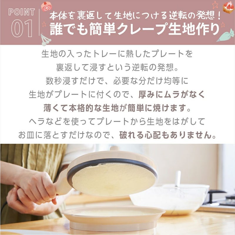 本体を裏返して生地を付けて焼くので、均一な厚さでクレープを焼くことができます。