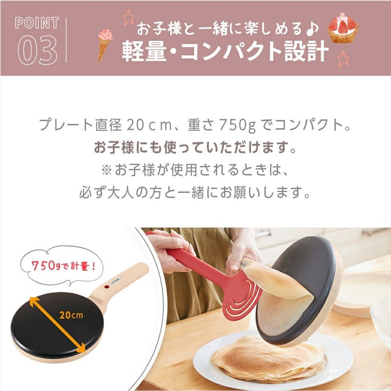 い本体は約750gと軽く、直径も20cmとコンパクトなためお子様にも調理を楽しんでいただきやすいクレープメーカーです。