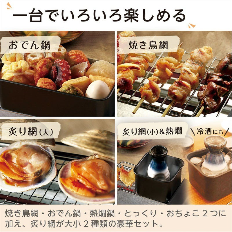 ■焼き鳥網・おでん鍋・熱燗鍋・とっくり・おちょこ2つに加え、炙り網が大小2種類の豪華セット。