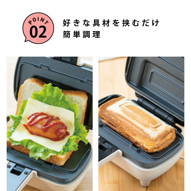 お好みの食材をパンにのせてフタを閉めるだけ。約3?4分でサクッと香ばしいホットサンドが焼きあがります。耳付き食パンを使えるので、耳を切り落とす手間もありません。※ホットサンドの焼きあがり時間は目安です。焼き足りない場合は時間を延長し、お好みで調節してください。