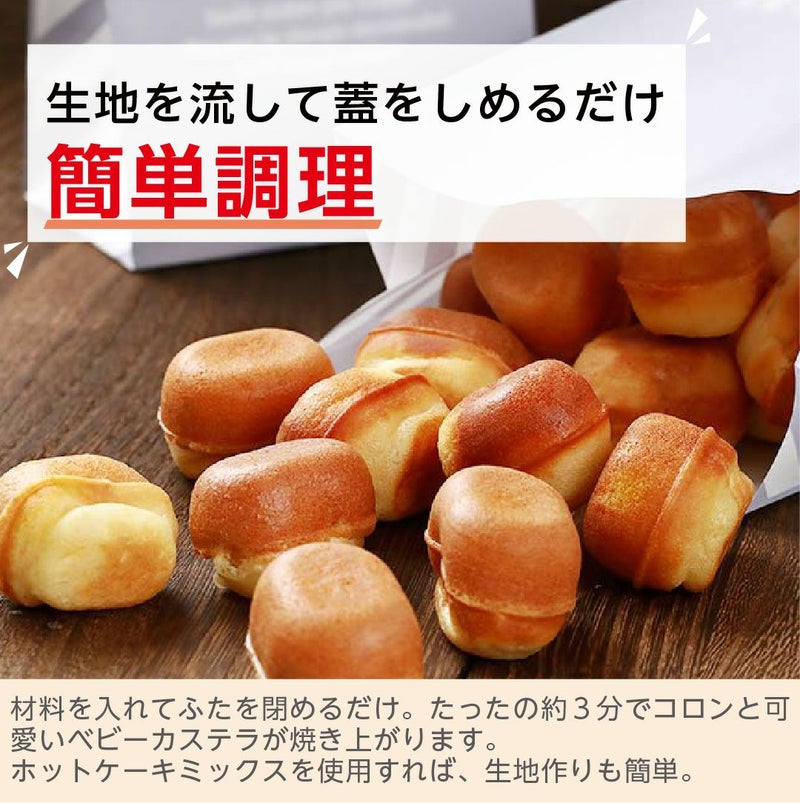 材料を入れてふたを閉めるだけ。たったの約3分でコロンと可愛いベビーカステラが焼き上がります。