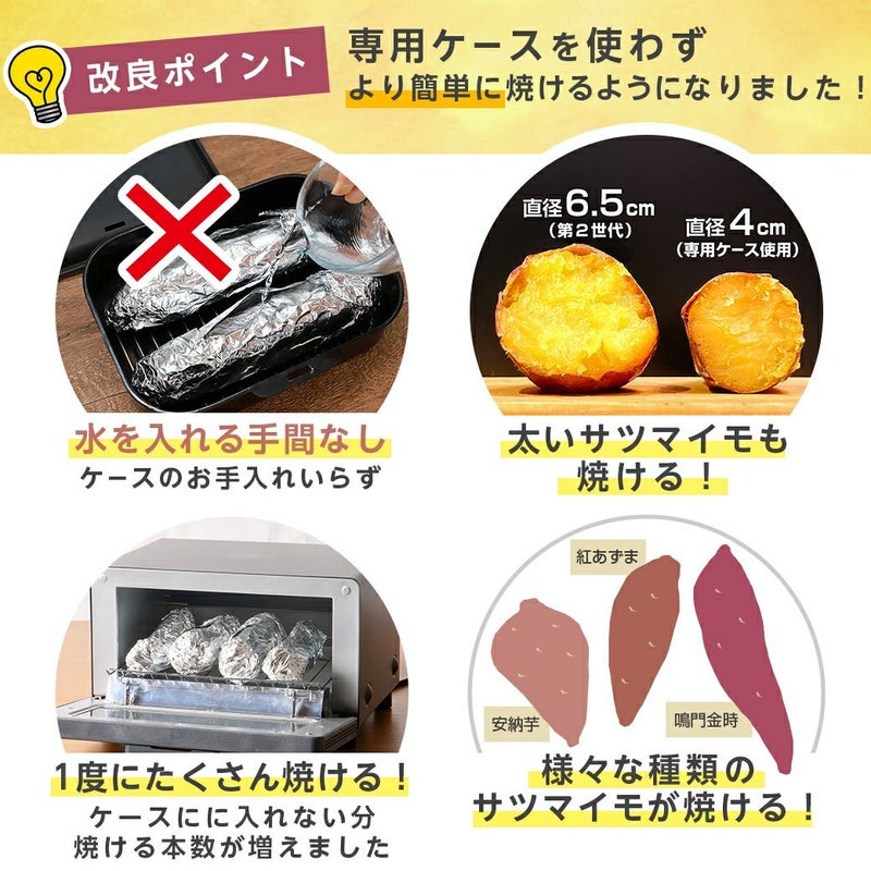 ・「超蜜やきいもモード」のプログラムを全面変更。初代の超蜜やきいもトースターで焼くのに必要だった付属品「やきいも専用ケース」を使わなくても焼けるようになりました。