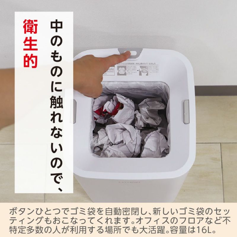 ✅ゴミ袋を自動で密閉ボタンを押すだけで投入口中央で熱圧着。ゴミ袋もそのまま新しいものに自動で交換してくれます。✅容量は16L16Lの小ぶりなゴミ箱なのでキッチンや洗面所などの小さいスペースにも設置しやすいです。✅USB充電式で置く場所を選ばない1回の充電で約45日間使用が可能です。✅カートリッジ1つで約25回分交換が可能です。✅おむつやペットシーツなどのにおいの気になるものも密封して捨てることができます