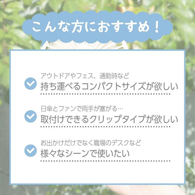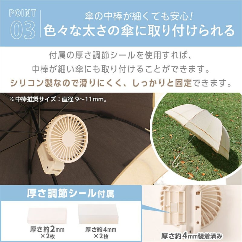 傘に取り付けて使える!挟む・持つ・置く3WAYタイプのミニファン。