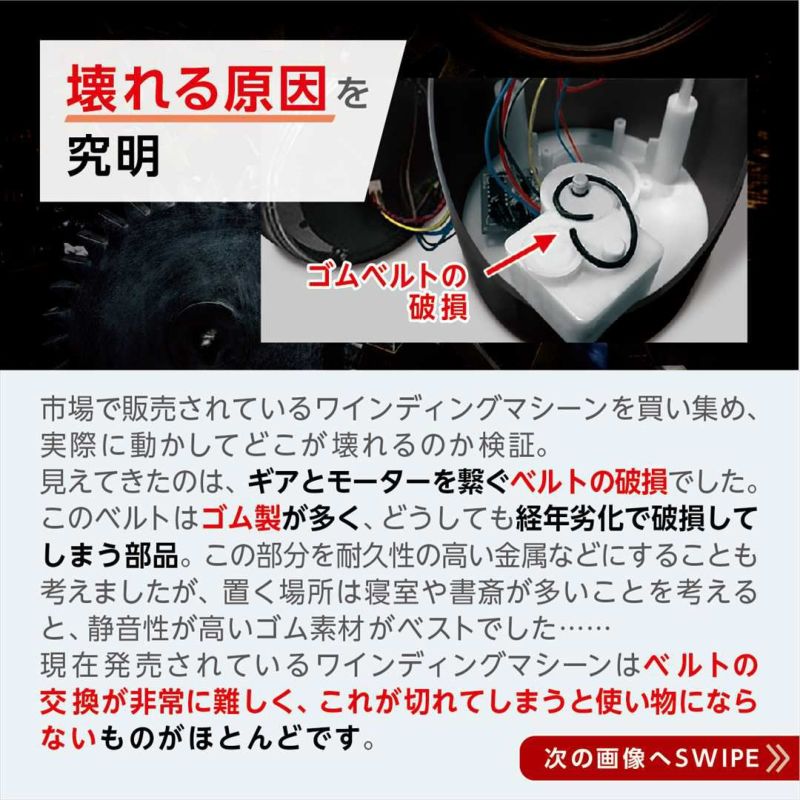 いずれ切れてしまうゴムベルトを使わず、回転させる方法はないかと模索し、実現したのが「ダイレクトローテーション構造」。この構造により、ゴムベルトを使わずに、可動部を回転させることを実現しました。