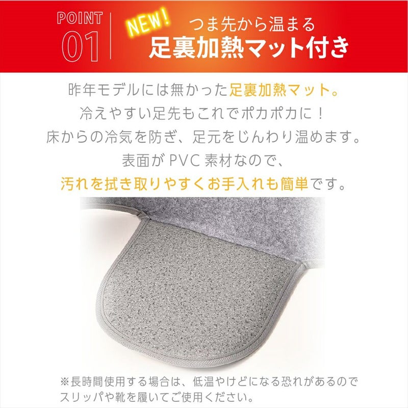 広い加熱面積のパネルヒーターが全方位から暖かく包み込み、冷えた足元を温めます。