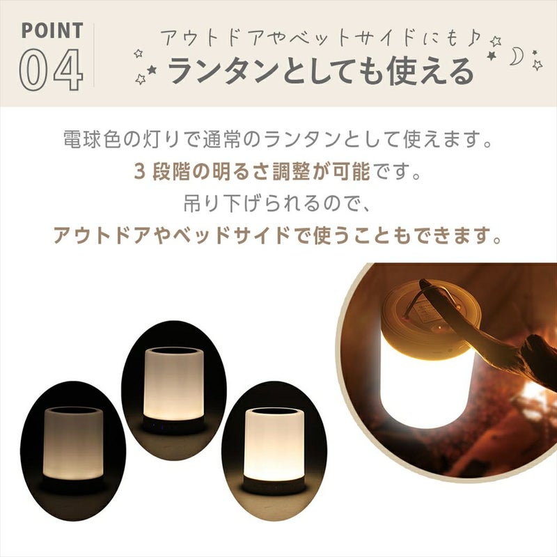 電球色の灯りでベッドサイドランプやランタンとして使えます。