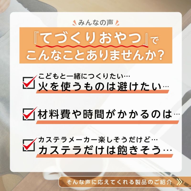 材料を入れてふたを閉めるだけ。たったの約3分でコロンと可愛いベビーカステラが焼き上がります。